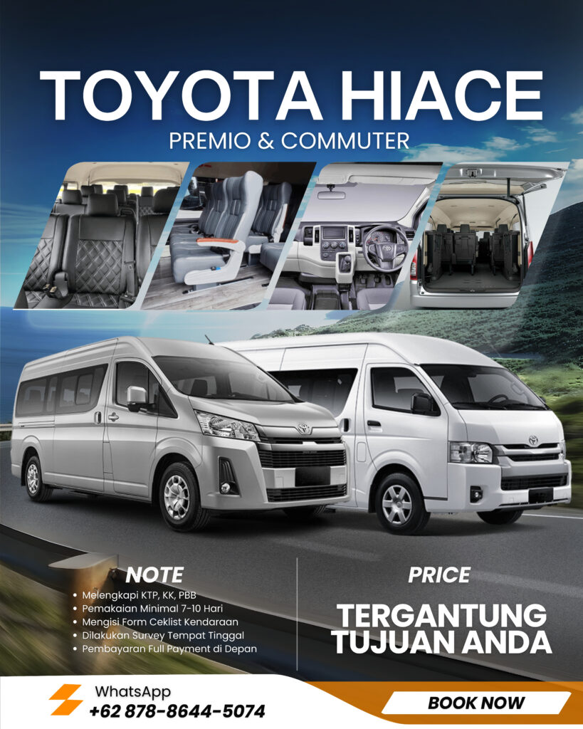 Sewa Mobil Toyota Hiace Commuter & Premio untuk perjalanan nyaman dan aman! Dengan kabin luas, AC sejuk, serta performa irit bahan bakar, cocok untuk perjalanan keluarga, bisnis, atau wisata. Layanan dengan sopir, harga terjangkau, dan kondisi kendaraan prima untuk pengalaman berkendara yang menyenangkan!